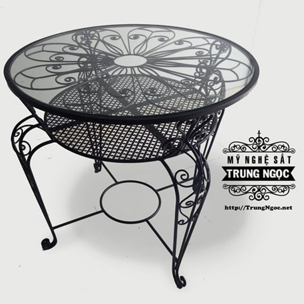 Bàn sắt - mặt kính, kích thước mặt bàn lớn 80x80cm, kiểu dáng cầu kỳ, có mặt đỡ phía dưới để đựng ly tách hoặc bộ đồ dùng. Bàn sắt thích hợp để cho không gian rộng rãi ở sân vườn.Sản xuất tại Việt Nam - công ty Mỹ nghệ sắt Trung Ngọc.