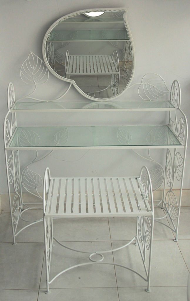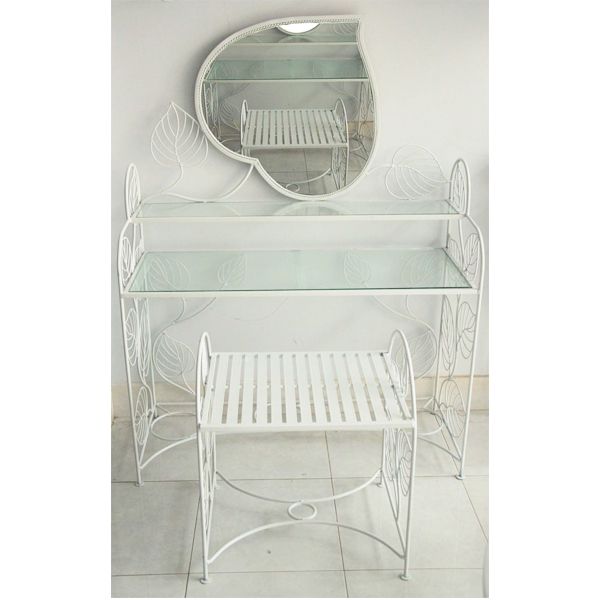 Bàn trang điểm được thiết kế độc đáo với hoa văn lá cây được uốn bằng sắt mỹ thuật cầu kỳ và tinh tế - là một sản phẩm không thể thiếu trong phòng ngủ của các bạn nữ. Với khung kính trang điểm hình chiếc lá đẹp độc đáo, phần kính thiết kế 2 tầng tạo không gian rộng rãi và tiện dụng để bạn có thể trưng bày và cất giữ các mỹ phẩm của mình. Chiếc ghế theo bộ được thiết kế vừa kích cỡ, thoải mái và rất gọn nhẹ.
