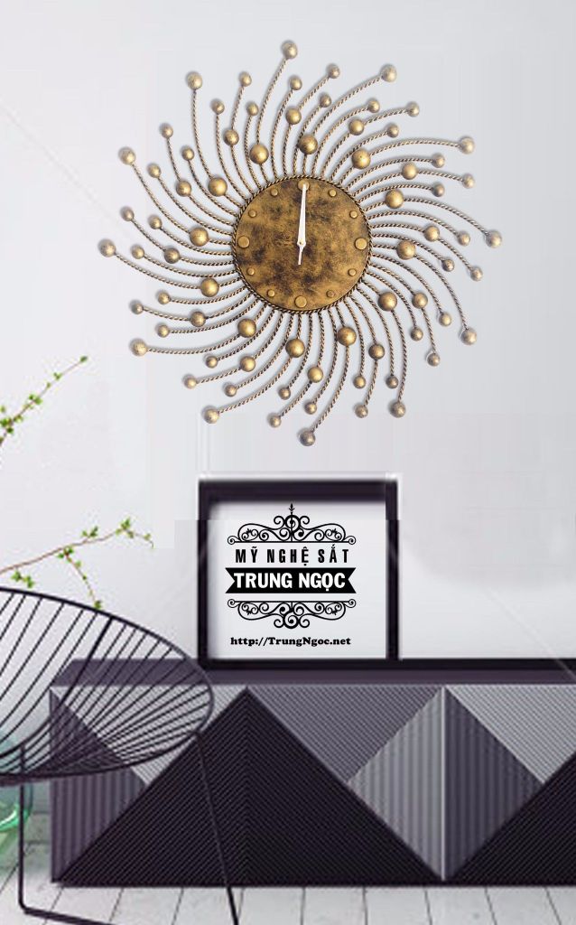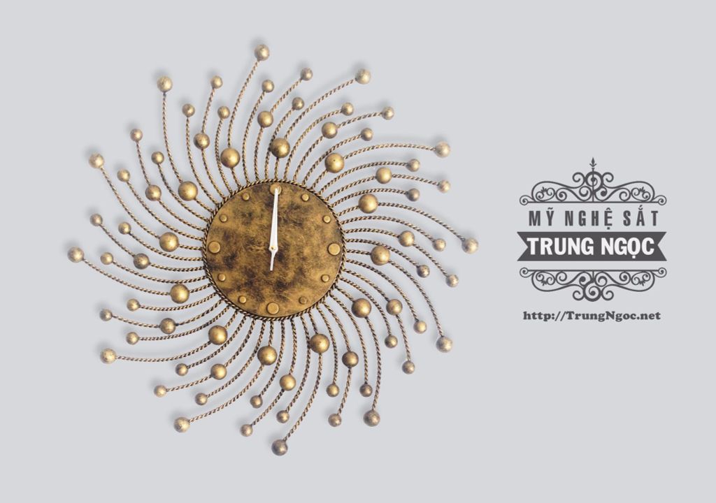 Đồng hồ được làm từ sắt mỹ thuật sơn nhũ đồng sang trọng, hoa văn độc đáo lấy ý tưởng từ hình ảnh mặt trời, cách điệu thành một bức tranh treo tường bắt mắt. Kích thước: 70x70 (cm)Sản xuất tại Việt Nam, công ty Mỹ Nghệ Sắt Trung Ngọc.