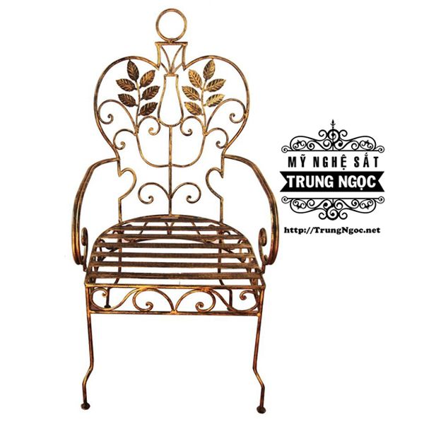 Ghế sắt được làm tỉ mỉ với hoa văn độc đáo, sang trọng, màu sơn nhũ đồng.