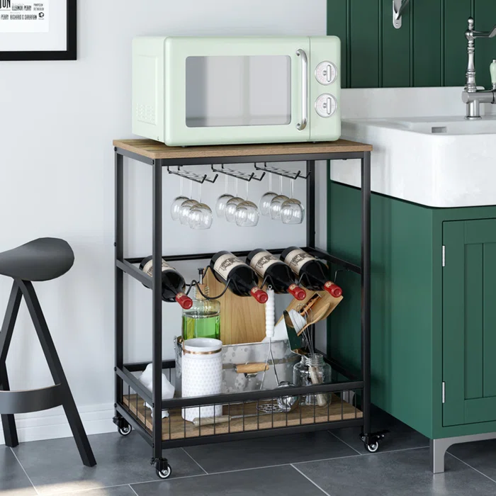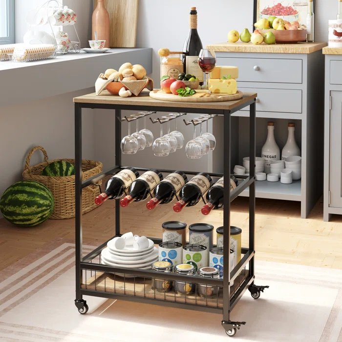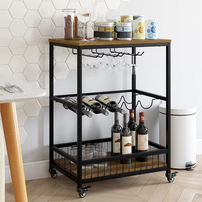 Xe đẩy rượu làm từ sắt nghệ thuật, thiết kế đa năng giúp vừa trưng bày chai rượu, ly rượu, vừa có thể làm một quầy bar mini ngay cạnh bàn tiệc, lại dễ di chuyển giúp bạn dễ dàng sắp xếp vào không gian nhà mình.