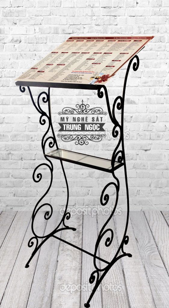 Kệ trưng menu - catalogue được thiết kế với sắt uốn mỹ thuật trau chuốt cực đẹp. Với kích thước vừa phải, sản phẩm là giá đỡ bắt mắt giúp tôn lên nét đặc sắc của menu - catalogue của cửa hàng.