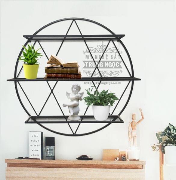 Kệ sắt tròn 3 tầng, kích thước kệ vừa, treo tường để trưng rượu / các vật dụng trang trí khác. Hoa văn sắt uốn đẹp và sắc sảo, mang phong cách nội thất hiện đại.